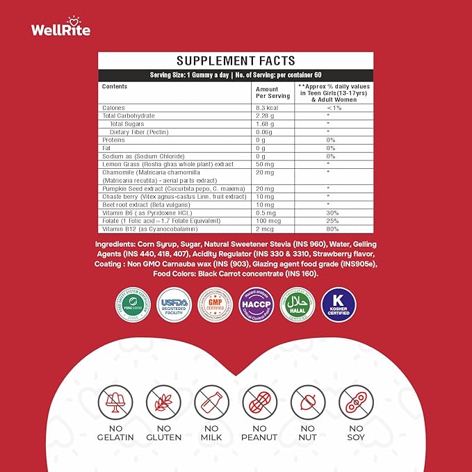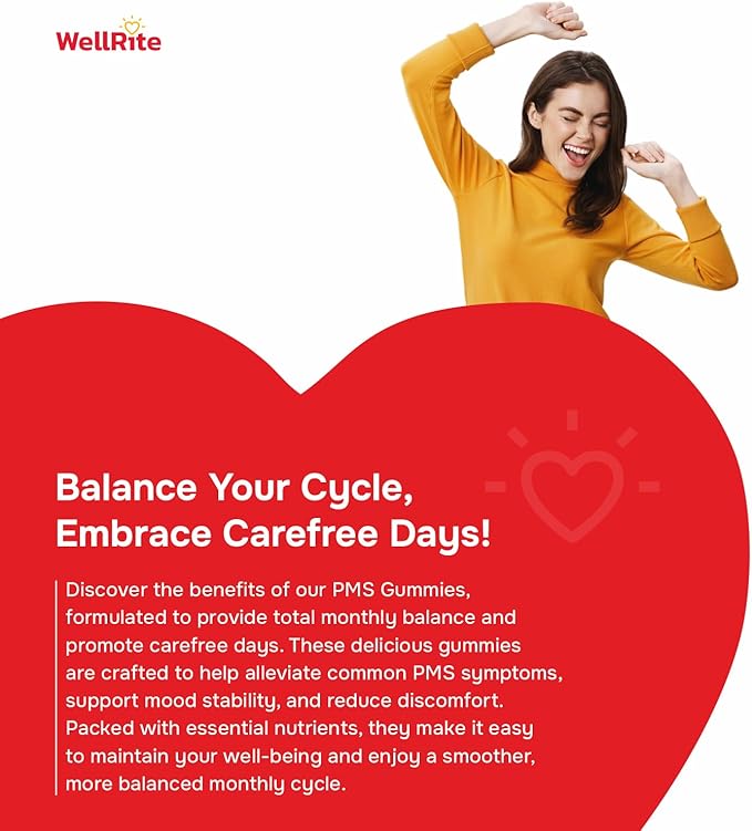 PMS Gummy Vitamins That Provides Total Monthly Balance & Carefree Days, 60 Count, Strawberry Flavored, Vegan, Gelatin Free, Gluten Free, Nut Free, Relieves Cramps, Normal Menstrual Flow