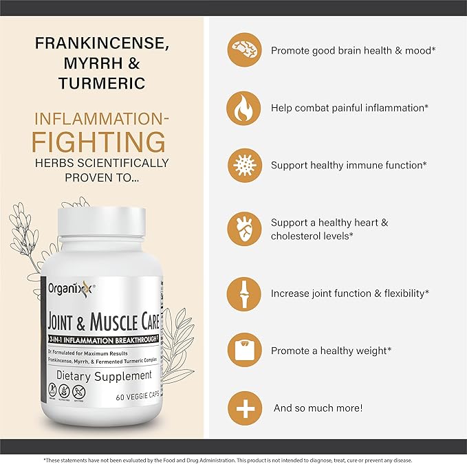 - JOINT & MUSCLE CARE CAPSULES: MADE WITH ORGANIC TURMERIC: This 3-1 joint health diet additive for women and men is made from frankincense, myrrh, and triple-fermented turmeric.