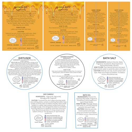 - UNIQUE 13 PIECE BATH SET - Our deluxe self-care package is filled with all the body soothing spa essentials a woman needs! Bubble bath, shower gel, bath salt, body scrub, hand cream, scented candle, bath oil, 2*shower steamers tablets, diffuser, 5pcs reed sticks, silk eye mask. Packed in a stunningly wrapped in a handmade basket, it also has a gift note card for you to personalize it.