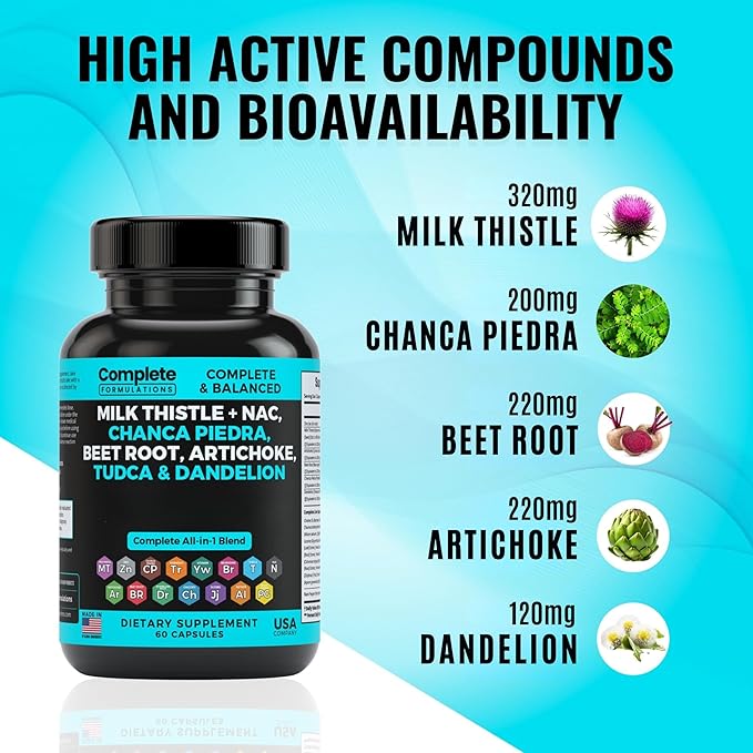 - POTENT ANTIOXIDANT PROTECTION β Rich in antioxidants, Complete Formulations Milk Thistle Supplement Blend helps neutralize harmful free radicals, reducing oxidative stress and supporting overall liver health. Contains Milk Thistle Extract, Beet Root Extract Powder, Artichoke Powder, Dandelion Extract, and proprietary Liver Support Blend