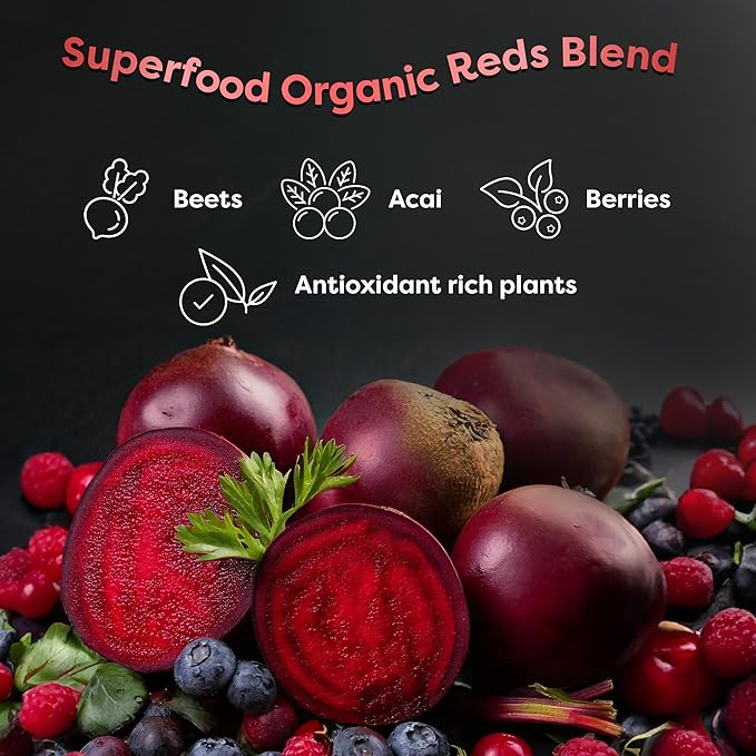 - Organic Reds Blend for Antioxidant Support - A potent mix of beets, acai, and berries to deliver plant-based wellness in every serving. Enjoy a tangy, fruity flavor in a convenient gummy form that’s easy to take at home, work, or on the go—no pills, no hassle.