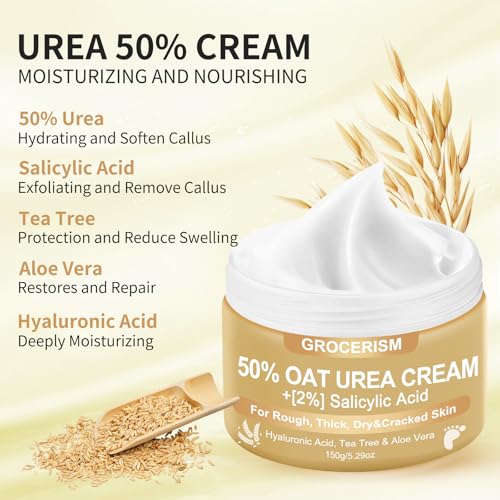 Urea Cream 50 Percent for Feet Maximum Strength 5.29 oz with Oat and 2% Salicylic Acid, Foot & Hand Cream included Hyaluronic Acid, Tea Tree and Aloe Vera for Deep Moisturizing, Callus Removing