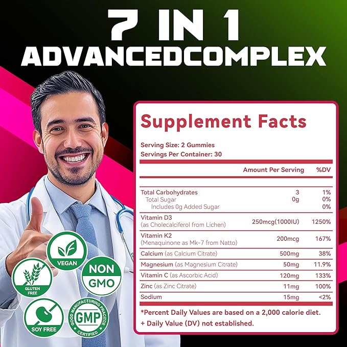 Sugar-Free Vitamin D3 K2 Gummies with Calcium + K2 (MK-7), Magnesium Citrate, Vitamin C, Extra Strength - Ultimate Absorption for Bone Muscle Teeth Immune, Vegan - 120 Gummies