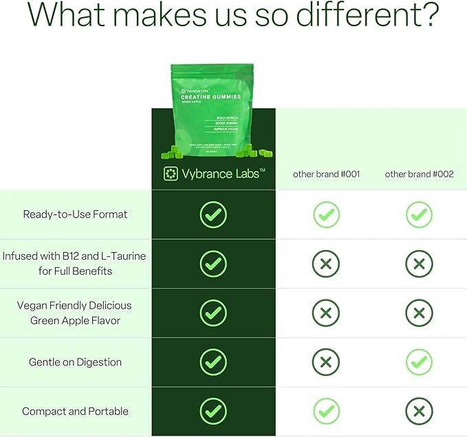 - Delicious natural ingredients: Ditch the chalky powders and bulky pills. Our sour green apple gummies provide a tasty, mess-free way to enjoy creatine, helping you stay consistent and motivated on your fitness journey. They are naturally colored with Seaweed Extract—no Artificial Dyes!
