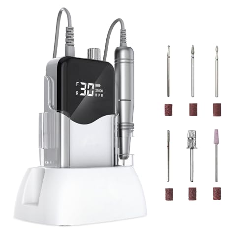 - Complete Nail Drill Kit: This electric nail drill is ideal for use at home or in a salon as it comes with 6 replaceable drill bits, including metal and ceramic bits. Additionally, the package comes with a handy base for safe positioning while in use