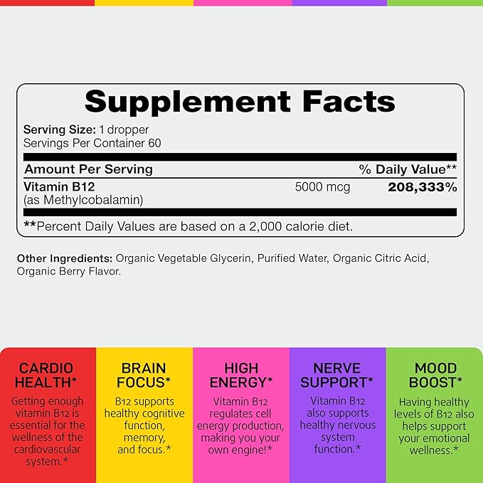 - All-in-One B12 5000 mcg - Experience the power of the Vitamin B12 drops. This fast-absorbing sublingual formula maintains your energy needs by converting food into fuel, helping reduce fatigue and increase stamina. B12 plays a crucial role in boosting immune function, maintaining brain health, memory, and mood, being a valid supplement for everyday use.