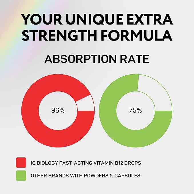 - B12 Vitamins for Women & Men - IQ Biology presents a sublingual B12 formula designed for fast absorption, offering support for overall well-being and healthy immune function. B12 drops provide daily energy support, helping to maintain healthy energy levels and overall vitality. Elevate your health routine with the convenience of this potent, easy-to-use formula, an ideal energy booster for women and men.