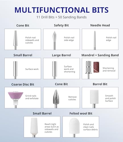 - Multi-drill Practical kit: The Nail Drill includes 11 3/32-inch shank drill bits and 56 sanding bands. It is fully functional to meet the more diversified needs of novice nail artists, such as polishing and engraving. Enjoy total control at your fingertips