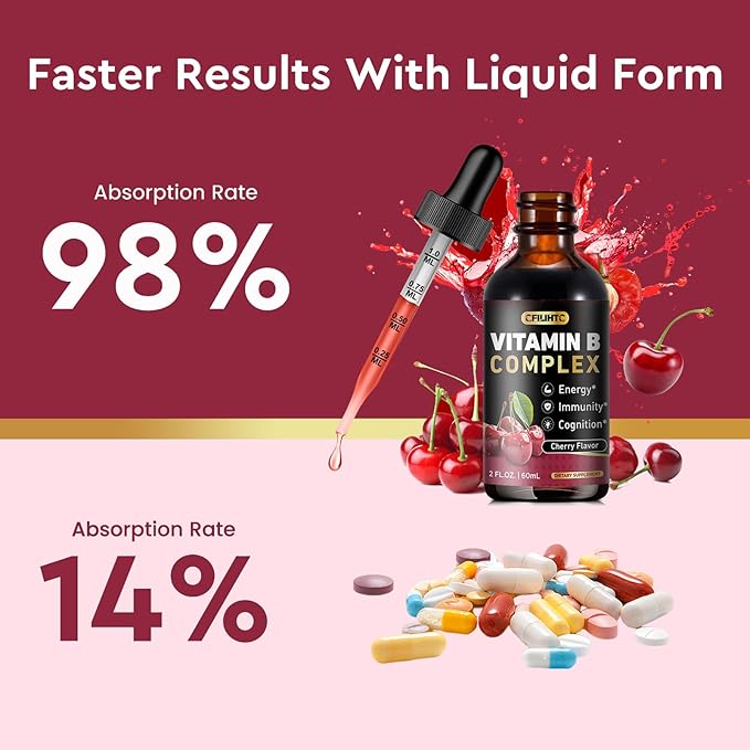 Vitamin B Complex Liquid Drops, B Vitamins Complex Supplement with B1, B2, B3, B5 B6, B7, B9 & Methyl B12 Drops for Adults & Kids, Vegan, Cherry Flavor