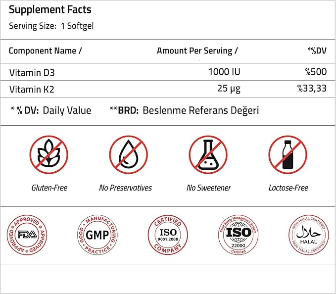 - Supports Bone Health & Calcium Absorption: Vitamin D3 helps increase calcium absorption, while Vitamin K2 ensures proper calcium utilization, directing it to bones and teeth instead of arteries or soft tissues.