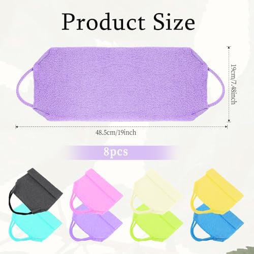 - 【Packaging Content】You will receive 8 pcs of exfoliating loofah back scrubber in 8 various colors. Including dark blue + lake blue + pink + yellow + dark gray + beige + purple + fluorescent green. The size of the back scrubber is 48.5x19 cm/ 19x7.48 inches. Enough quantity and proper size can meet your daily use and replacement needs.