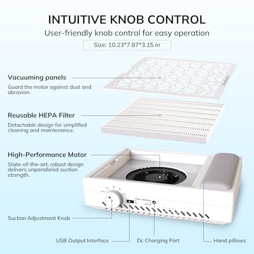 - Professional Portable Dust Collector for Nail Techs: Equipped with a knob speed controller for easy suction adjustment, this nail dust collector operates with low noise and high power. Simply twist the knob to regulate the suction. Capable of capturing nail dust and flying ash from all angles, this dust collector nail tech features a compact size (10.23 X 7.87 X 3.15 inches) that won’t take up too much space on your nail table, making it perfect for nail, foot care professionals and salons.