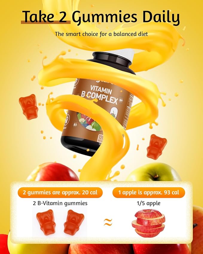 - Delicious Apple Flavor, Easy to Absorbed: Vitamins gummies are easier to take and digest than traditional pills. You can taste the sweet and savory apple flavor with every chew! Take just two gummies a day (fully chewed) - a convenient and enjoyable way to increase your intake of B vitamins.