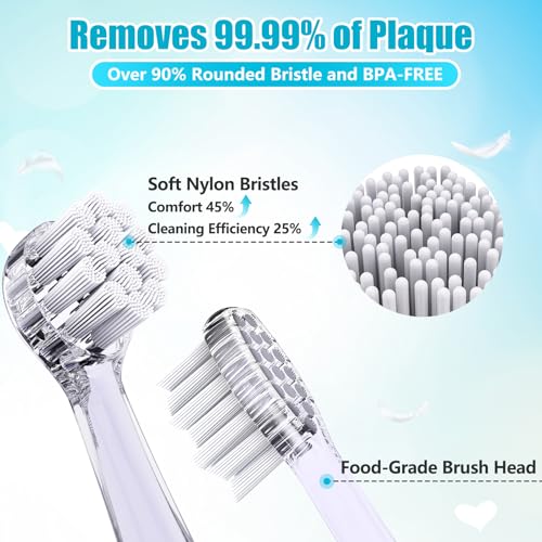 - Toddler Electric Toothbrush Specifically for Kids Aged 0-3: Babies start to sprout their first tooth around six months. This baby electric toothbrush features a soft LED light to help locate food residue and plaque. It is equipped with a 17,000 VPM motor (A+) and bristles with a roundness rate of over 90% (A+), protecting their mouths from cuts. It effectively prevents plaque and cavities caused by milk, with a cleaning efficiency 3.5 times higher than manual toddler toothbrushes.