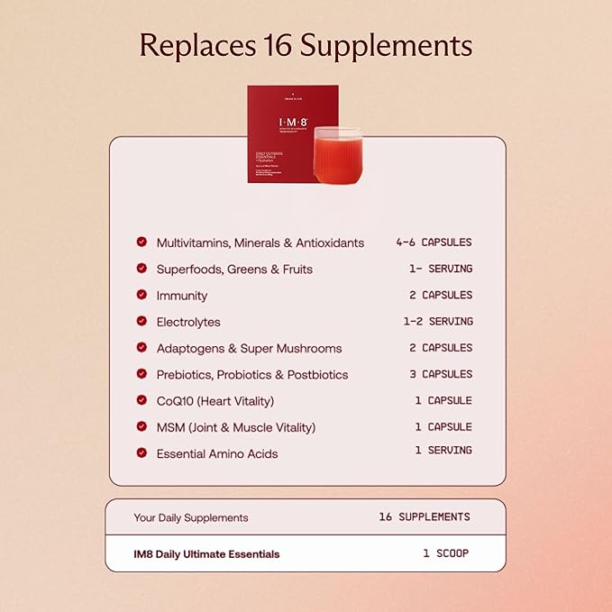 - DAILY ULTIMATE ESSENTIALS: Your daily foundation for energy, focus, digestion, and whole-body wellness support—in one delicious and easy-to-mix drink. IM8 Daily Ultimate Essentials is a science-backed, all-in-one supplement for men and women designed to simplify daily nutrition with a science-backed formula. With 92 nutrient-rich ingredients, including essential vitamins, minerals, superfoods, and clinically studied doses of CoQ10 and MSM, IM8 supports hydration, digestion, energy metabolism, immune function, and overall well-being, including key nutrients for hair, skin, nails, joints, muscles, and heart health.