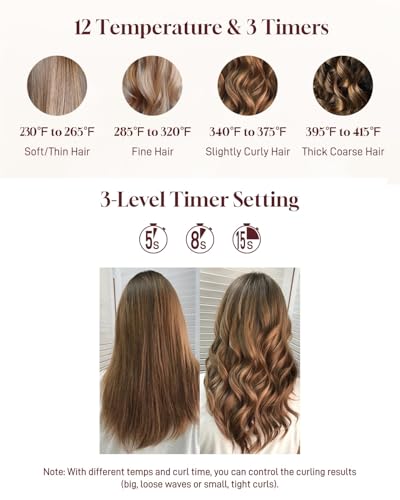 - 12 Temperature and 3 Timers: With different temps, direction, and curl time, you can control the curling results (big, loose waves or small, tight curls). Our Auto curling iron is available in 12 temperature options (210℉-415℉) to suit a wide range of hair types. And the 3 smart timing settings (5s, 8s, 15s) can meet your different styling needs and create the hairstyle you want with ease.