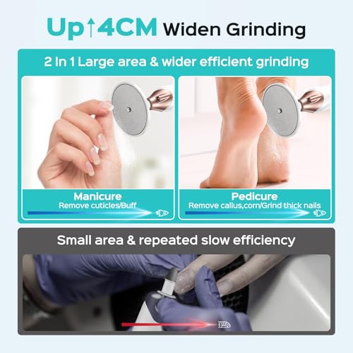 - 【Powerful Motor, Easy Cuticle Trimming】This nail grinder set with a quieter and more powerful motor, low vibration and quick heat dissipation. The upgraded motor torque can reach 425gf.cm, making it easier to trim and polish thick nails, dead skin, calluses and corns on hand and feet. You don't have to worry about the electric nail drill stopping when pressure is applied during grinding.
