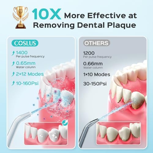 - Professional Cleaning and Care Oral: This water flosser was developed by the COSLUS R&D team in collaboration with dental experts. Water dental pick offer advanced high-frequency pulses (10-160 PSI, 1400 pulses/min), which means they adapt to every user, proven to eliminate 10× more plaque than manual brushing. This water floss is designed orthodontic, braces, sensitive gums, and daily care through 12 adjustable pressures and 5 specialized tips, solving oral cleaning challenges while protecting gum health