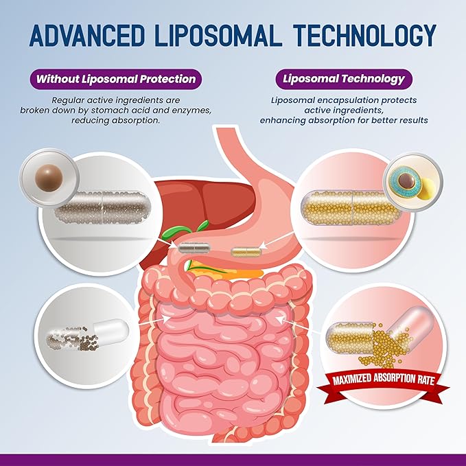 - Liposomal Delivery - Unlike traditional methods, our formula uses advanced liposomal technology to enhance ingredients absorption, ensuring your body gets the most from every capsule, for maximum support, day after day.