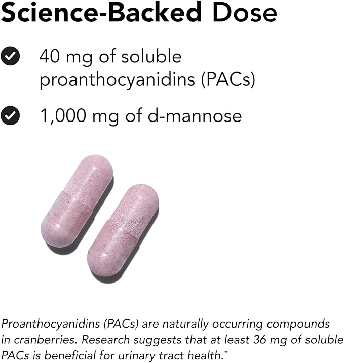 - Cranberry Extract + D-Mannose: 40 mg of soluble proanthocyanidins (PACs) & 1,000 mg of d-mannose per dose; Cranberry & d-mannose flush out the urinary tract in two unique ways, supporting overall urinary tract health*