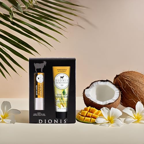 Dionis Goat Milk Skincare Hand Cream & Lip Balm Set - Safe For Sensitive Skin, Moisturize, Hydrate, Dry Chapped Lips and Skin, Cruelty Free, Honeysuckle & Coconut and Mango Madness, 1 oz and .28 oz