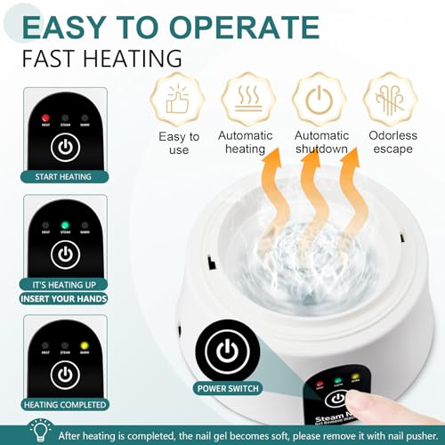 - EASY TO USE: Turn on the electric nail soaking bowl and pour in nail polish remover. In the meantime, use the nail file to grind the nail gels, put your hand in the machine when 'STEAM' the green light is on. When the preset time is up, the machine will automatically shut off. If the nail gel has not softened, turn the machine on again and repeat a cycle.