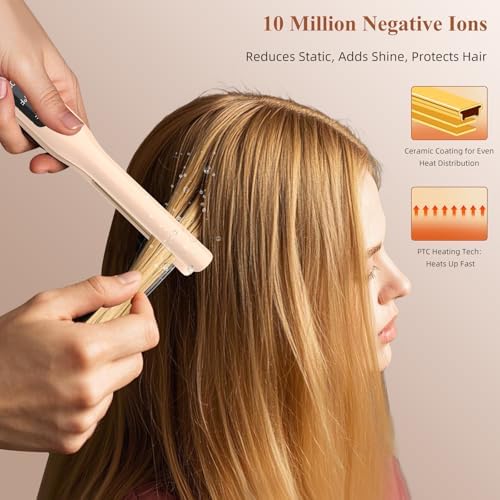 - ACHIEVE SMOOTH HAIR STYLES:Flat iron hair straightener features unique combination of PTC heater that heats up in just 10 seconds and Ceramic Glaze ionic hybrid materials, protecting hair from heat damage and leaving it smooth and shiny. The negative ions from the ceramic tourmaline plates neutralize static, repair, and protect your hair while styling, ensuring a frizz-free, radiant finish every time.