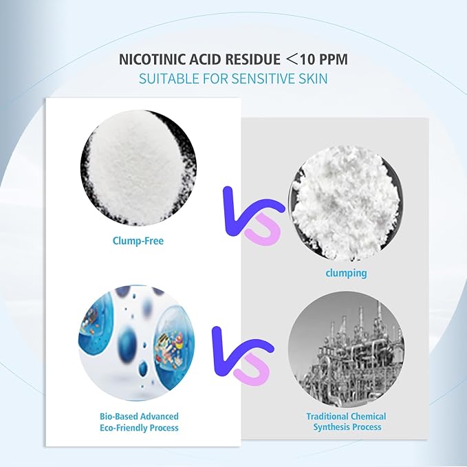 - Low Nicotinic Acid Residue: With a Nicotinic Acid residue of less than 10 ppm, this cosmetic grade niacinamide powder is ideal for sensitive skin, providing a soothing skincare experience without irritation. Enjoy the benefits of the ordinary niacinamide powder, specifically formulated for safety and efficacy.