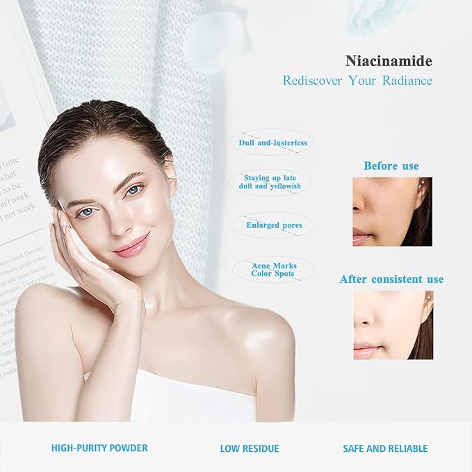 - Multi-Purpose Beauty Benefits: As a powerful ingredient, niacinamide can help improve skin texture, reduce the appearance of fine lines and dullness, leaving your skin smoother and brighter. Ideal for use in serums, toners, and a variety of beauty products, our niacinamide powder is a versatile addition to any skincare arsenal.