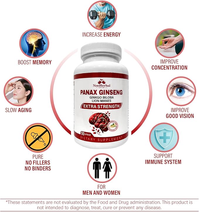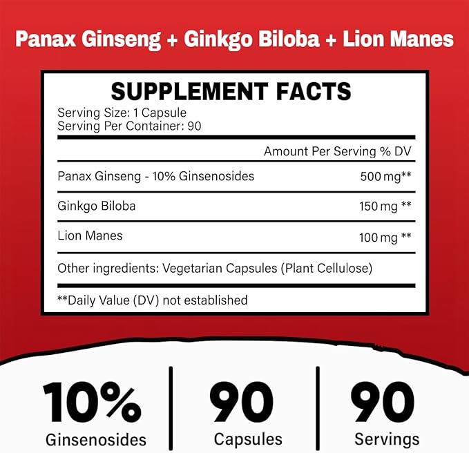 - ๐ฟ Premium Herbal Blend for Enhanced Wellness: Crafted with 500mg of Panax Ginseng, 150mg of Ginkgo Biloba, and 100mg of Lion's Mane Mushroom, our supplement combines three potent herbs known for their traditional benefits. Panax Ginseng is celebrated for boosting energy levels, Ginkgo Biloba supports cognitive function, and Lion's Mane Mushroom is renowned for its potential to enhance memory and focus