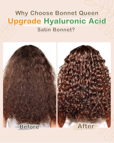 - Double Moisture and anti-frizz Satin Bonnet for Sleeping: Made of hi-tech Hyaluronic Acid Senior Satin: Lock moisture for curly hair, dry natural straight hair, locs,etc, greatly protect hair anti-breakage, more smooth, no-frizzy.