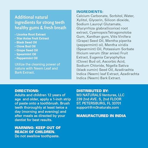 - No more plaque with neem: M3 Natural's flouride free neem toothpaste targets surface stains on your teeth that may have latched on from different food and drinks you consume on a daily basis. Best used twice a day and after meals, or as recommended by your dentist.