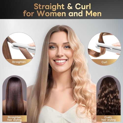 Cordless Hair Straightener and Curler 2 in 1 Ceramic Flat Iron Mini Cordless Portable Travel Hot Tools Straight Curl for Women Men USB Rechargeable with Pouch (White)