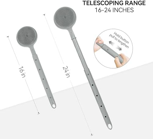 - 2. Adjustable Long Handle with Secure Grip: Equipped with a stainless steel button for 5-level length adjustment (16-24 inches), this back brush reaches all body areas effortlessly,especially friendly to people with elderly and limited mobility. The ABS handle with anti-slip texture ensures firm control, even when wet, suitable as a back washer for shower men/women.