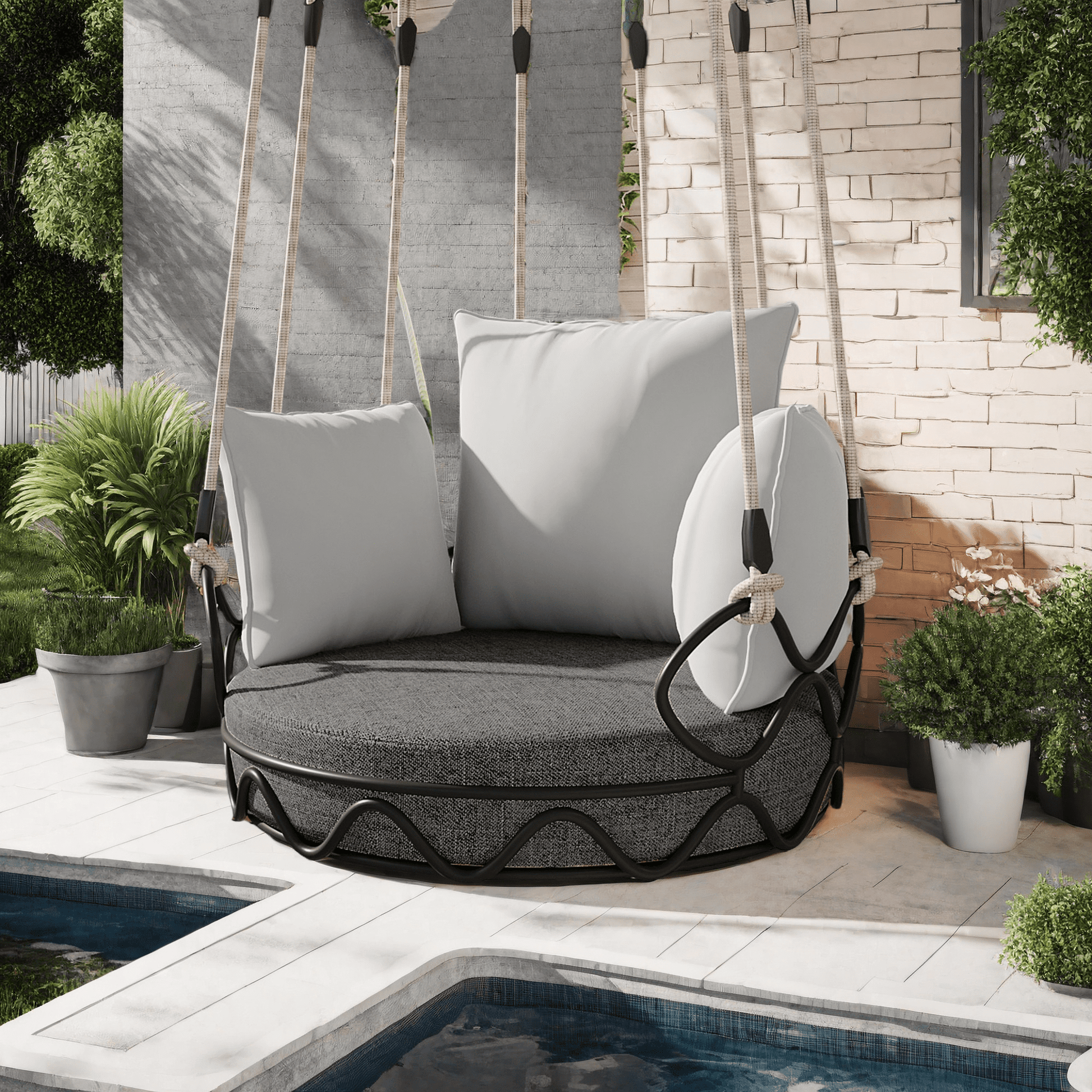 Hang this egg swing chair outdoor from pergolas, sturdy tree branches, or indoor ceiling beams. Its compact footprint (34'L x 32'W) fits snugly in corners, while the neutral Beige or Grey color blends with any décor—from modern patios to bohemian bedrooms. Includes 3 accent pillows for extra coziness!