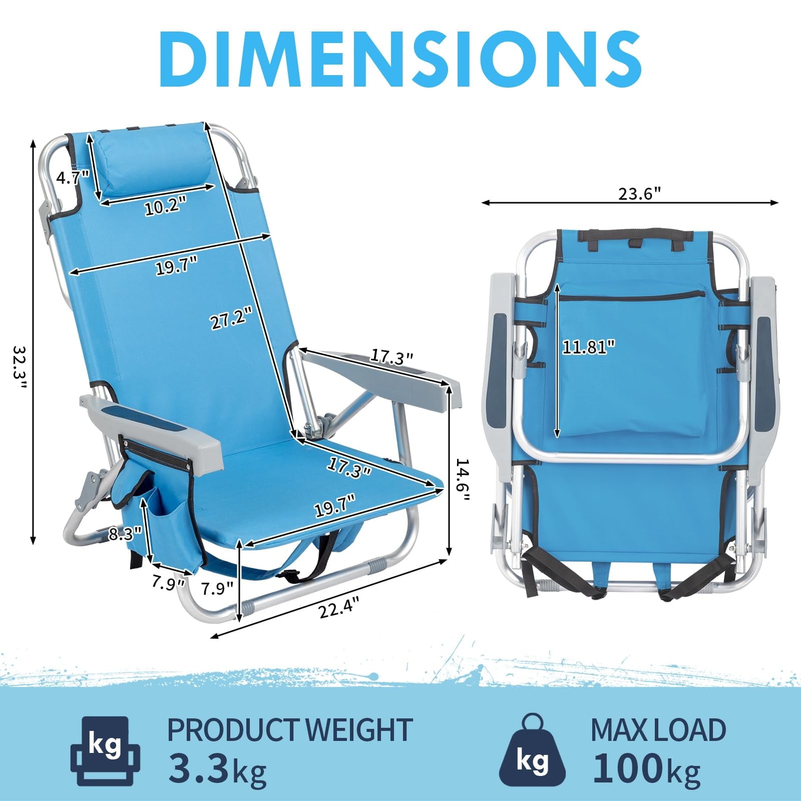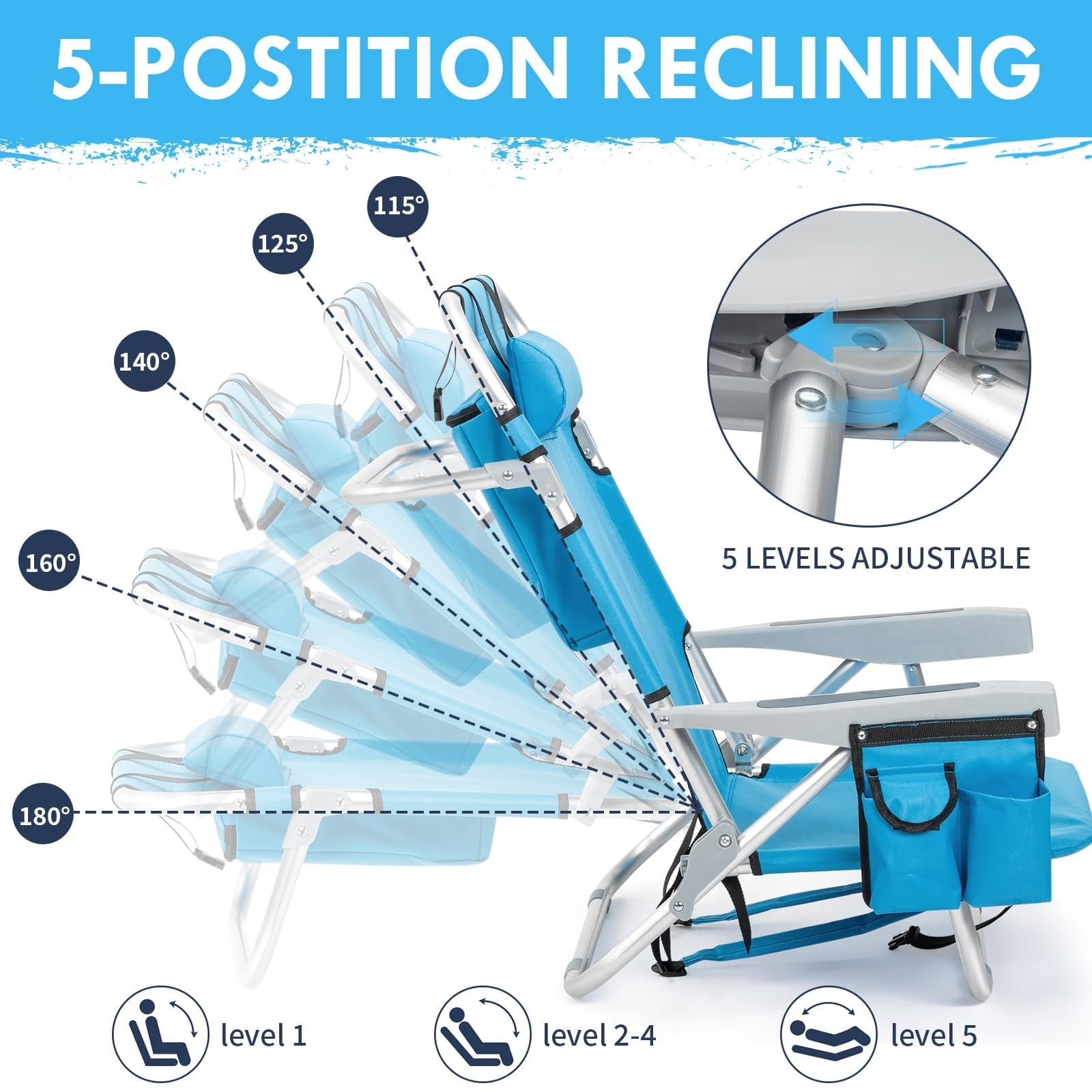 Upgrade your outdoor relaxation with our 5-Position Adjustable Beach Chair – the perfect companion for beach trips, camping, picnics, and outdoor adventures. Designed for ultimate comfort, this heavy-duty backpack beach chair features a reinforced aluminum frame (supports 330lbs) and 600D Oxford fabric for long-lasting durability. The 5-level adjustable backrest (100°–165°) lets you find your ideal angle for reading, sunbathing, or napping, while the removable padded headrest and ergonomic armrests ensure superior support. Stay organized with the built-in cooler pouch, storage pockets, cup holder, and towel bar – everything you need for a hassle-free day outdoors. Plus, its lightweight foldable design (7lbs) with backpack straps makes transport effortless. Whether you're headed to the beach, park, concert, or campsite, this portable reclining chair delivers comfort and convenience wherever you go!