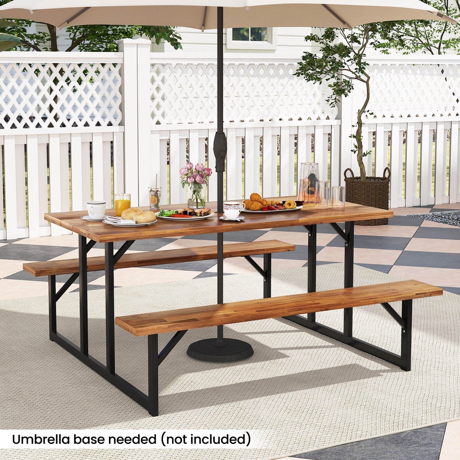 Enjoy the great outdoors with this stylish picnic table and bench set made from solid acacia wood, a natural material known for its high strength and long service life. The set includes 2 built-in benches and a large tabletop, perfect for accommodating up to 6 people for picnics or gatherings. A convenient 1.97' coverable umbrella hole allows for shade on sunny days, while the sturdy wood surfaces are easy to maintain and painted for extra durability. Supported by a robust metal frame, this set is designed for stability with anti-slip foot pads for safety. Ideal for any outdoor space, this versatile camping table and bench set provides a stylish and practical spot to relax and enjoy nature with loved ones.