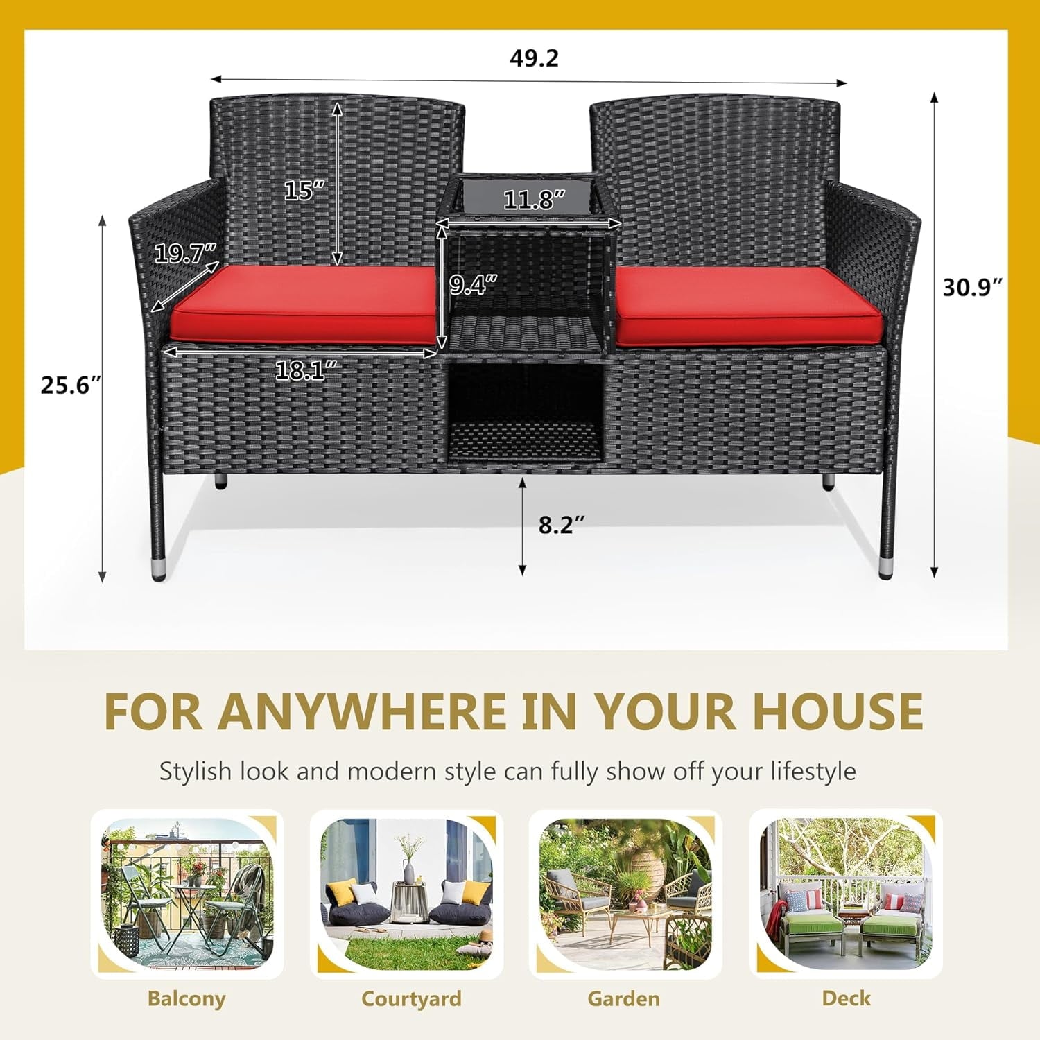 CRXX Outdoor Furniture Patio Loveseat Wicker 2-Seat with Built-in Table and Cushions Rattan Porch Chairs Bench for Balcony, Lawn, Backyard (Red)