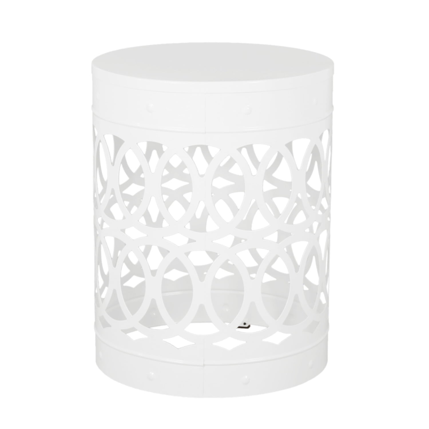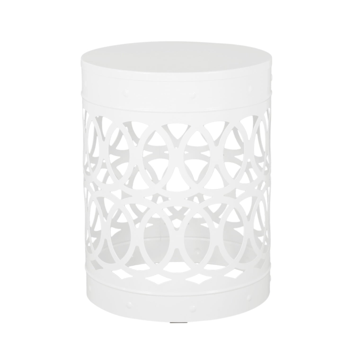 Product InformationMain Color: WhiteMain Material: IronProduct DimensionsAssembled Length (in.): 13.75Assembled Width (in.): 13.75Assembled Height (in.): 18.00Weight (lbs.): 9.26Package SizeLength (in.): 21Width (in.): 17.5Height (in.): 17.5Weight (lbs.): 11.99Product FeaturesMODERN : With clean, precise lines, our side table set is the ideal modern accessory for your space.Finished with a charming cylindrical structure and iron cut , each table not only offers a chic, minimalistic look but also provides incredible structure.IRON CUT : Refined with an elegant iron cut , the frame of each table brings an elegant touch to the overall piece, making it an understated yet chic addition to your home. These feature a beautiful overlapping circle pattern.POWDER-COATED IRON FRAME: Constructed of powder-coated iron, the frame of each table is made to be incredibly durable, ensuringthat this set will hold up under use.DIMENSIONS: Choose an accessory that is the perfect size for you and your furniture.The large accent table is 13.75â W x 13.75â D x 18.00â H and the small accent table is 12.00â W x 12.00â D x 16.00â H. You will love how much your space can transform with the simple addition of this charming table.NO ASSEMBLY: This accent table set comes ready to use straight out of the box.No assembly is required.This comes as a set of two.Description