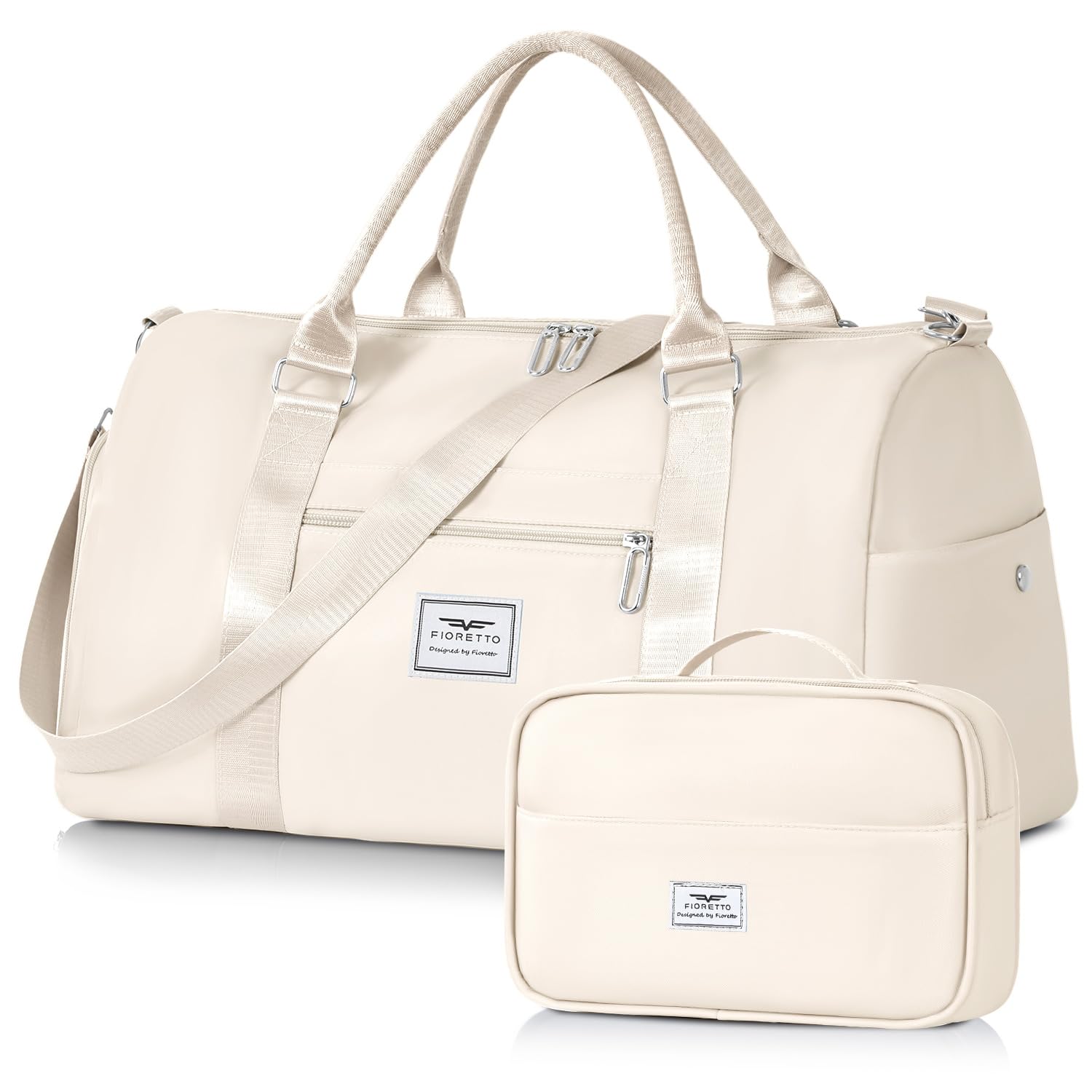 FIORETTO Womens Gym Tote Duffle Bag with Toiletry Bag, Sports Duffel Overnight Hospital Workout Carry on Bag for Girls with Wet Pocket & Shoe Compartment, Ideal for Travel, Swimming, Dance Beige