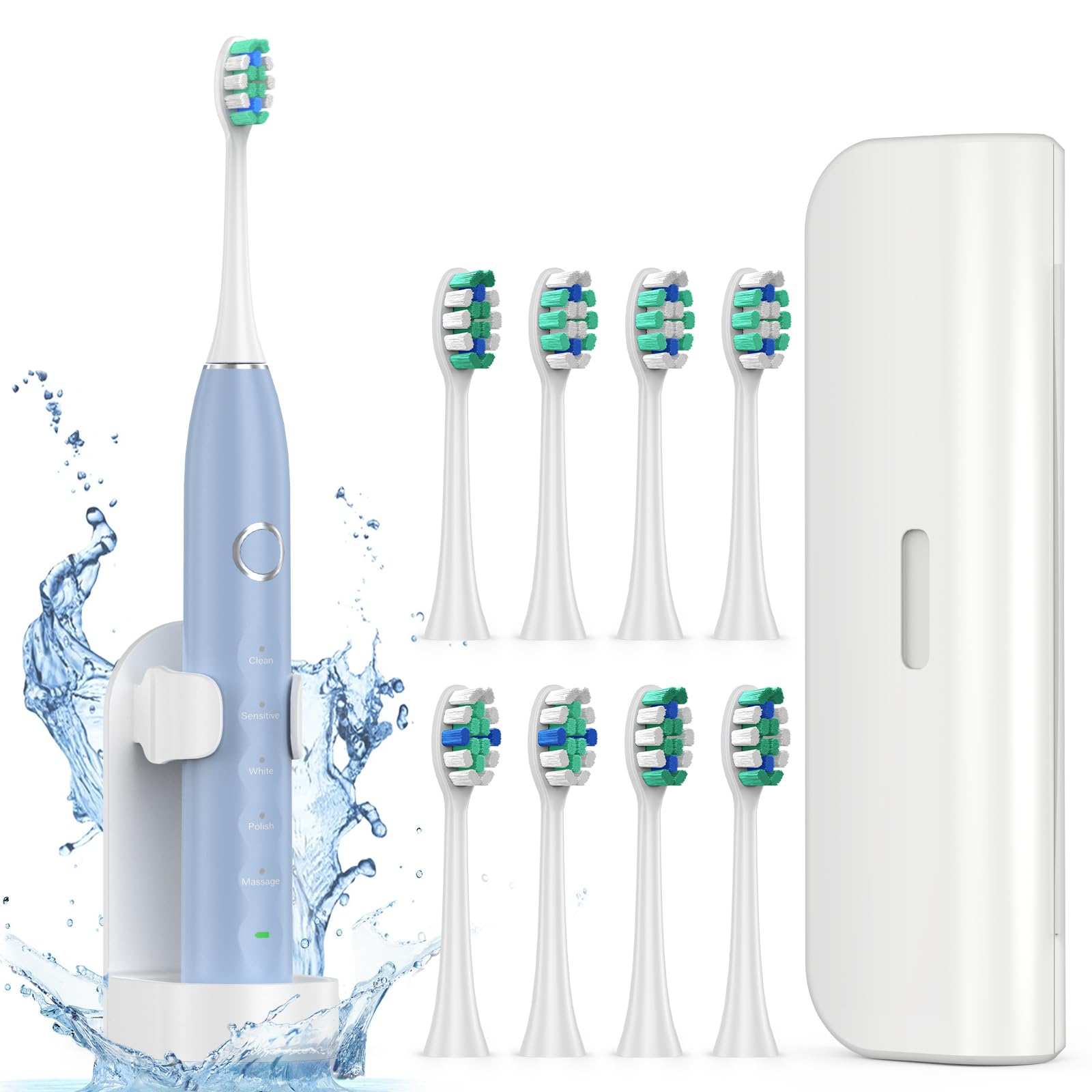 Fronix Electric Toothbrush for Adults with 8 Brush Heads, Sonic Toothbrush Rechargeable with a Holder & Travel Case, 2.5 Hours Charge for 120 Days Use - Light Blue