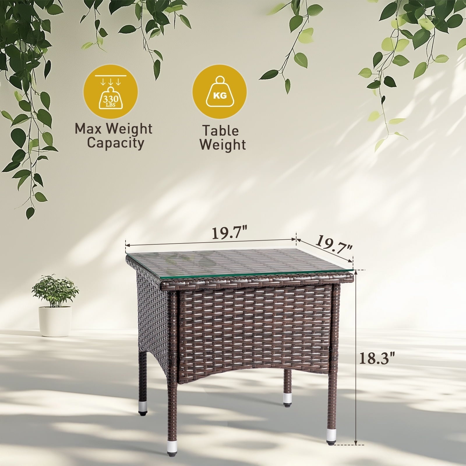 Funnil Patio Wicker Rattan Side Table with Square Tempered Glass Top, All-weather Use Rattan Coffee End Table for Deck, Porch, Garden, Indoor&Outdoor, Brown