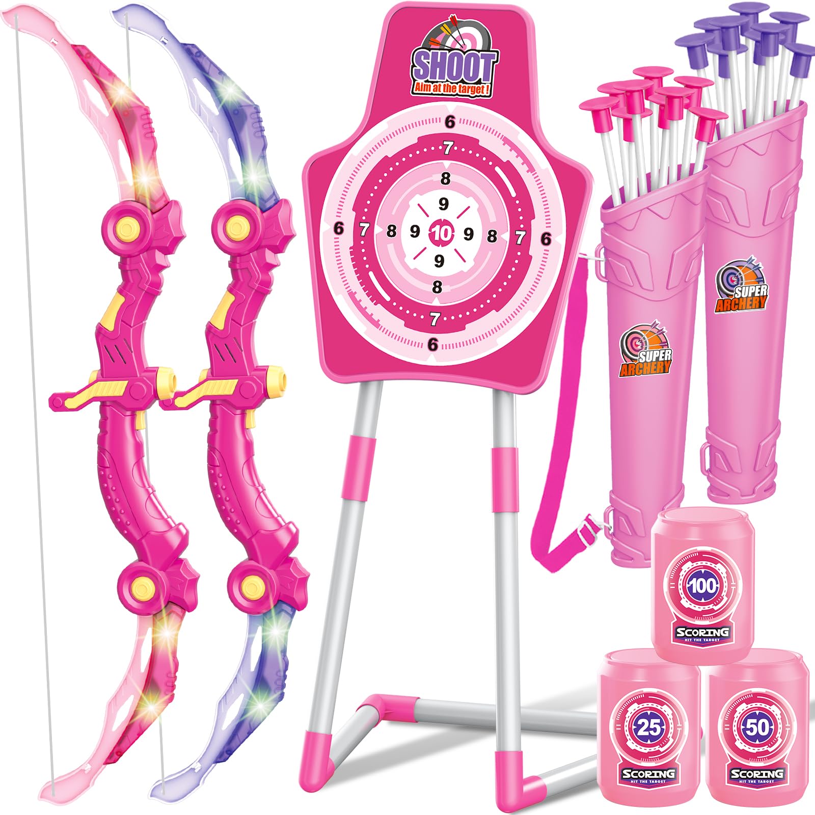 Details: Bow and Arrow Toys for 5 6 7 8 9 10 Years Olds Girls, Archery Set Includes 2 Super Bow with LED Lights, 20 Suction Cups Arrows,Archery Set with Standing Target,3 Target Cans,Gift for Kids