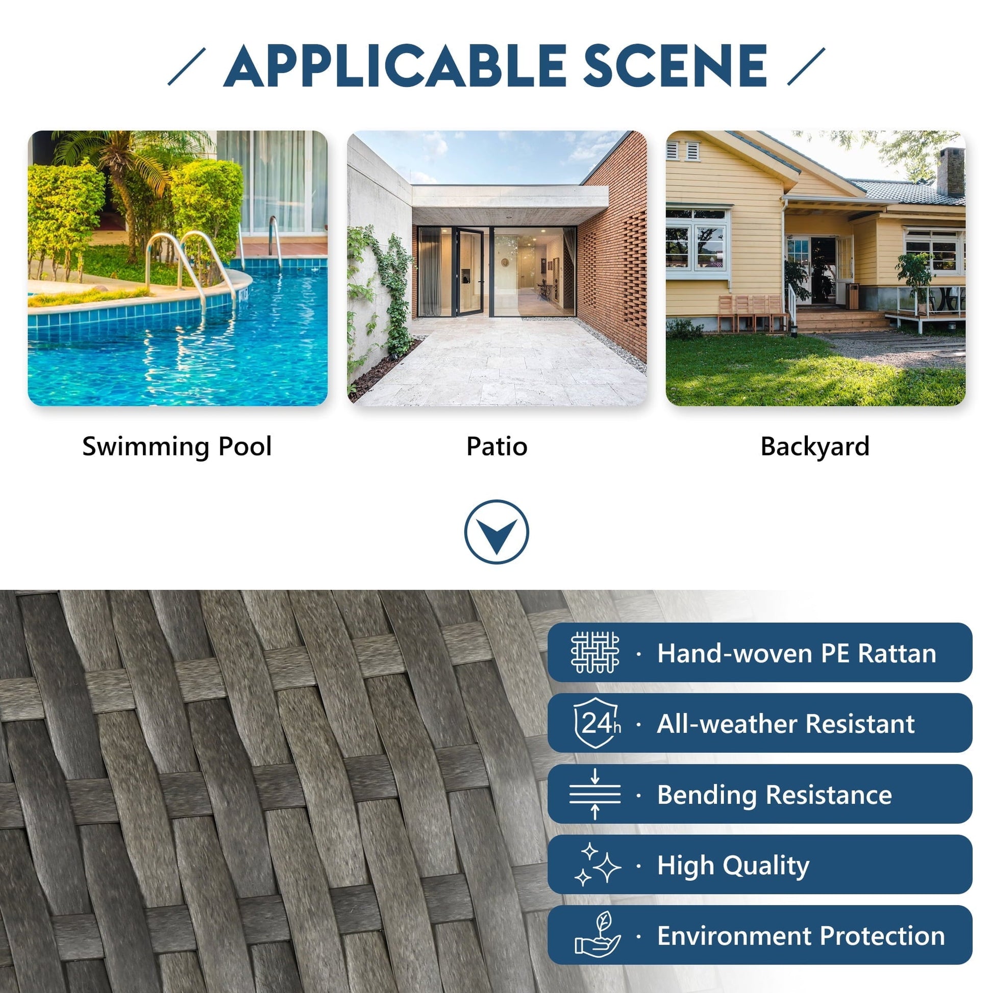 Product DescriptionIntroducing the Outdoor Sun Bed, known for its durability and style. It's crafted with high-quality PE rattan materials ensuring longevity, perfect for your outdoor relaxation. All cushions and pillows are zippered for easy cleaning. Measuring 79.9 inches in length and 52.4 inches in width it can comfortably accommodate two adults. The adjustable canopy on the lounger shields you from sunlight, allowing for the ultimate relaxation experience. The half-package stylish curved armrests provide support where needed while still exhibiting elegance. Featuring a comfortable backrest and an sloped angle, you can easily recline while enjoying the outdoors. Don't worry about bringing extra pillows as the lounger includes two large gray pillows and two colorful decorative pillows. Adjustable feet for uneven ground make you comfortable in any place. Enjoy the best of the outdoors time with this Outdoor Sun Bed!AssemblyRemovable CushionsYesPillows IncludedYesWith ZipperYesWeight Capacity500 lbsAdult Assembly RequiredYesAdditional Tools RequiredAll Tools IncludedAssembly TimeAbout 1 hour