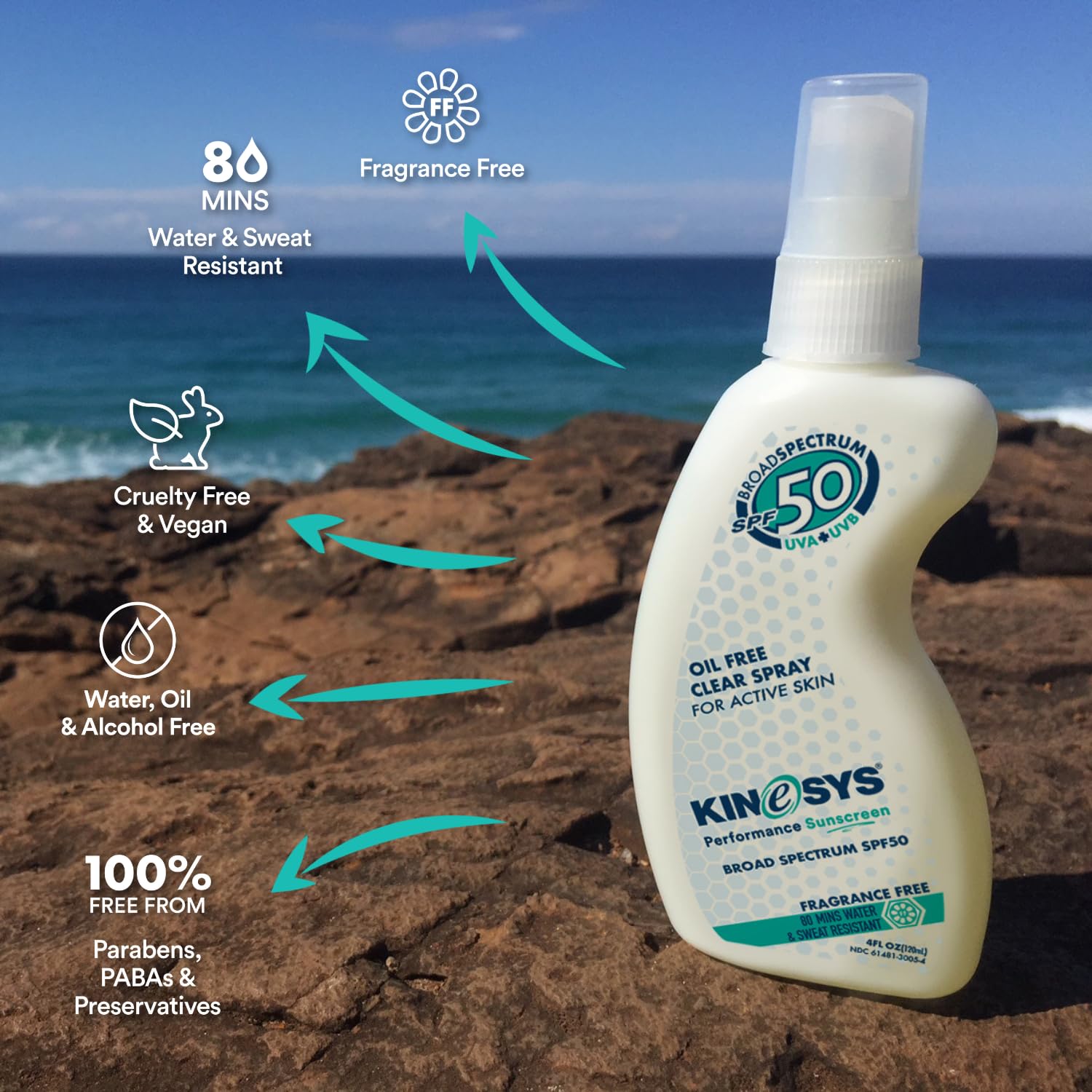 KINeSYS Fragrance Free Clear Spray Sunscreen for sensitive skin, SPF 50, Hypoallergenic, Broad Spectrum UVA/UVB protection for Face & Body; PABA and Oxybenzone FREE, 700+ Sprays, 4 Fl Oz/120 mL