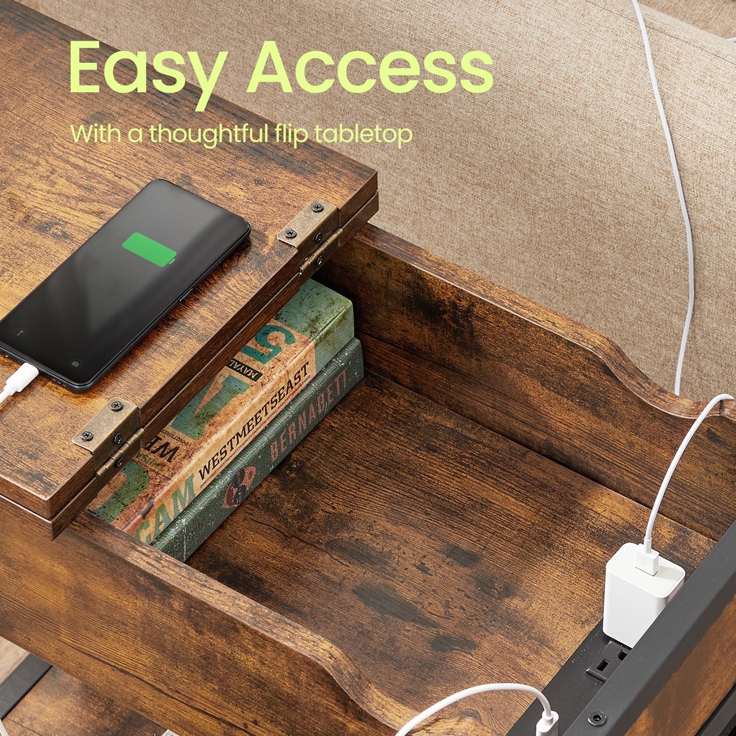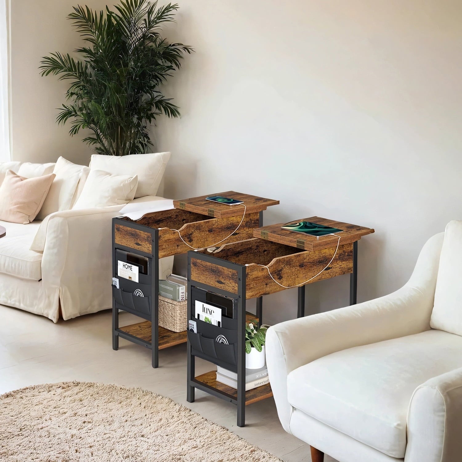 Upgrade your space with this functional 2-piece set of charging side tables that combine smart organization with modern convenience. Each table features a versatile charging station (2 AC outlets + 2 USB ports) with strategically spaced 4.9ft cords to power multiple devices simultaneously. The innovative design includes both open shelving and hidden flip-top storage, complemented by three sized fabric organizers (9.1' large, 9.1' medium, and small bottom bags) for perfect item categorization. Thoughtful details like cord management grooves and a side-mounted power strip maintain a clutter-free look. Measuring 23.6' tall, these rustic brown tables with black steel legs effortlessly blend into bedrooms, living rooms, or any tight space needing both style and function.Material: Steel Frame, Particleboard, Fabric BagSize of Each Table: 23.6”D x 12.4”W x 23.6”H (60 x 31.5 x 60 cm)Size of Power Strip: 2”D x 5.1'W (5 x 13 cm)Cord Length: 4.9 ft (150 cm)Weight of Each Table: 23.4 lb (10.6 kg)Max. Static Load of Each Table:Max. Static Load of Tabletop: 22 lb (10 kg)Max. Static Load of Storage Compartment: 22 lb (10 kg)Max. Static Load of Bottom Shelf: 33 lb (15 kg)