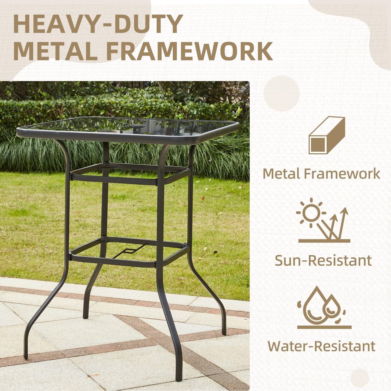 MELLCOM 32'' Outdoor Bar Table, Metal Outdoor Table with 1.57'' Umbrella Hole, High Top Patio Bar with Tempered Glass for Balcony, Backyard, Poolside, Garden, Black