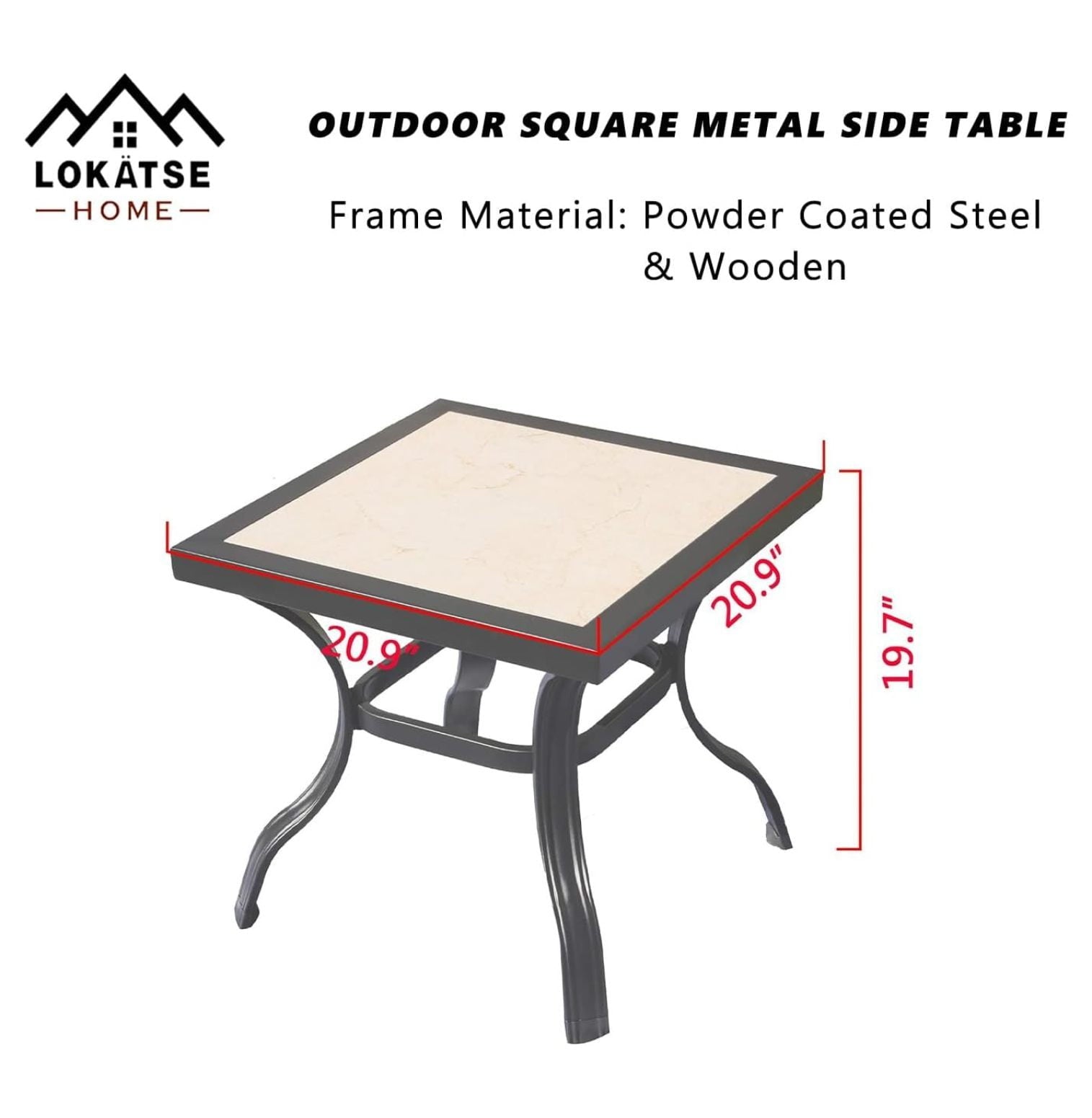 Specifications Features Specifications Color Black Table 20.9' (L) x 20.9' (W) x 19.7' (H) Material Metal Frame Features Built from a powdercoated steel frameStylish design fit with your backyard decorSteel frame, sturdy and durablePorcelain table topEasy to clean Outdoor Square Table Add fun to your outdoor experience When you are outdoors with friends or with your family. You always want to have such comfortable and stylish outdoor furniture. Our store will a high quality, stylish and comfortable home brand. It can be used in many occasions and can add decoration to your backyard, pool and more. Description This outdoor furniture includes 1 Table. If youre looking for a collection of outdoor furniture, Our store is your best choice. Sturdy Frame Powder coated wrought iron which support a long time use. Easy To Clean Porcelain table top, easy to clean. Modern Design The modern design is suitable for outdoor decoration.