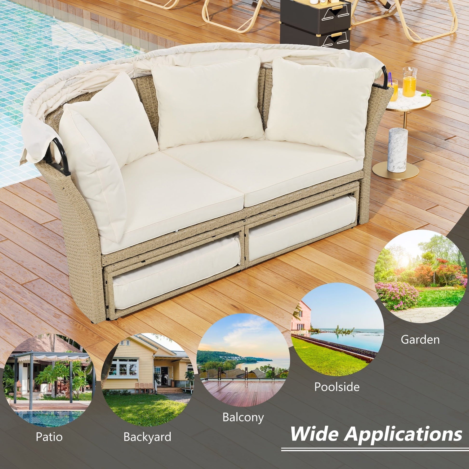 Outdoor Rattan Double Daybed with Retractable Shade, 4 Pillows Included for Lawn, Garden, or Poolside, Beige