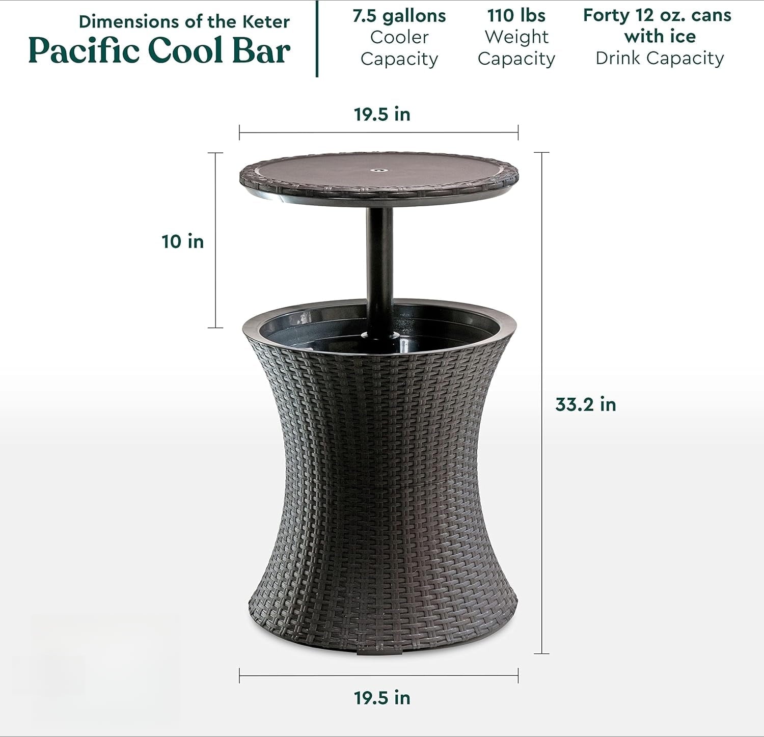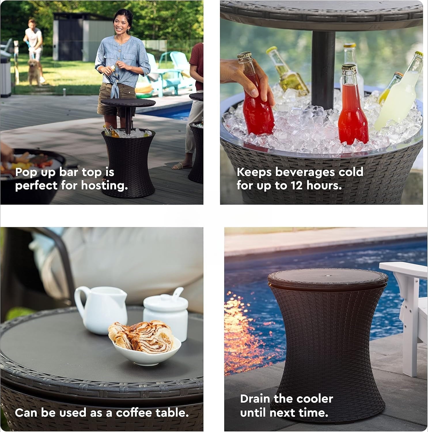 Product DescriptionWant to convert your Cool Bar from cooler/coffee table into a party-perfect cocktail table? Simply lift the lid and twist the locking ring. Voila! Cold drinks, Cool Bar, instant party! And to keep the party going, the Cool Bar's 7. 5 gallon cooler can keep drinks chilled for more than 12 hours! The top rises smoothly from 22. 5 inches to 32. 5 inches in overall height and locks into place to prevent it from falling when topped with party provisions. And when you are done, simply remove the built in drainage plug for easy cleanup. When you’re ready to change the mood, the top of the cooler can be twists back down into a sleek cocktail or coffee table. As friends gather around the Cool Bar, you can feel confident that this contemporary piece adds just the right element of class and style. So whether you want a stylish accent table or a functional party accessory, you can have it all -- with the Cool Bar from . While the compact design will easily fit into the layout of even the smallest deck, patio, or yard space, if you have larger outdoor living areas, you can place one on either side of each sofa, love seat, or chair to use as end tables. It would then be easy enough for you to pull out all of the Cool Bars and stock them with beverages and ice whenever you decide to host a large gathering. Features & Benefits: Dimensions: 19. 5D x 33. 2H in. Lid extends upwards into table 10 in. above rim Sturdy engineered legs for optimal support 7. 5 Gallon drink storage capacity to handle up to 40 12 oz. cans with ice Built in drainage plug makes cleanup a breeze Beverage cooler keeps drinks ice cold for up to 12 hours Sleek contemporary design blends with a wide variety of indoor or outdoor patio decor Table top locks in place for easy access to drinks Weather-resistant - can be left outside without worrying about rust, decay and other weather-related damage Easy to assemble, easy to maintain and easy to use Perfect centerpiece for your outdoor gatherings or summertime parties
